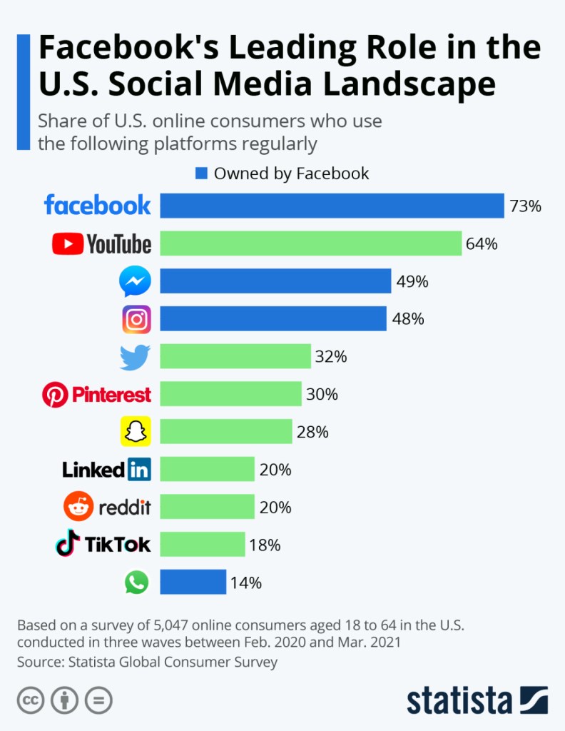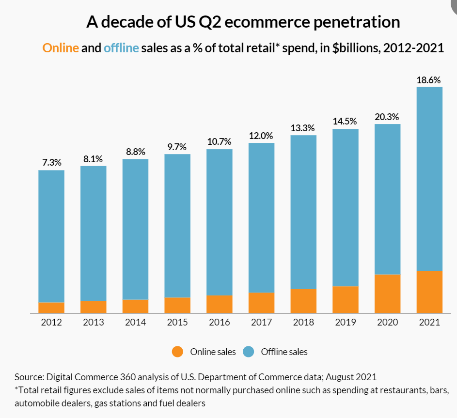 Brief conceptual summary. E-commerce is the selling and buying of products online. E-commerce in 2021 made up 18.6% of all U.S retail sales. If you estimate conservatively, that number should be 25-30% by 2030. If E-commerce is trending up globally (many people don’t have internet service or smartphones yet) it makes sense that more money will be poured into social media influence marketing/advertisements. The number one platform for advertisers to flock towards is Facebook or a platform owned by Facebook.