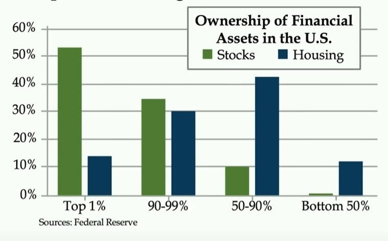 Why are the majority of Americans so poor? This chart shows they have too much exposure tied up in housing and not enough in stocks. The wealthiest Americans show much higher ownership of stocks and significantly less in housing.