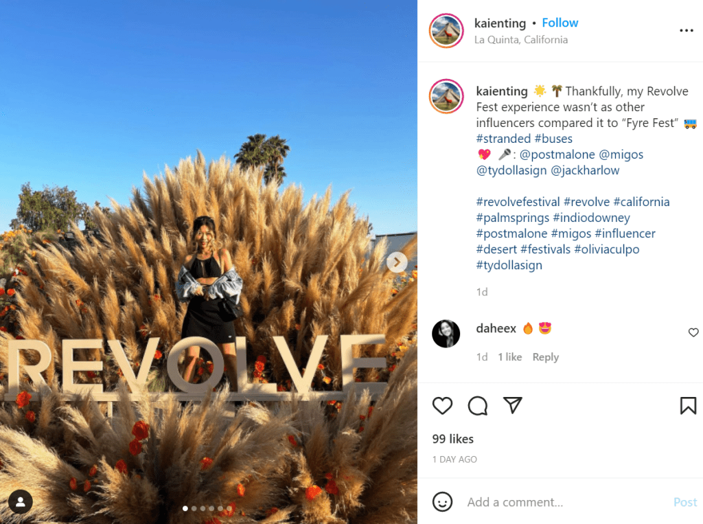 Revolve Festival is the creme de la creme event for influencer marketing, explaining the crazy demand they get. The festival has become more prominent than the actual festival, Coachella. They get more likes and impressions than H&M, Coachella’s official partner. Revolve has been running circles around global brands that bring in billions every year. The influencers complaining are likely the same people that would pay $10,000 or more to attend this festival if they could be treated like Kim Kardashian or Kendall Jenner.