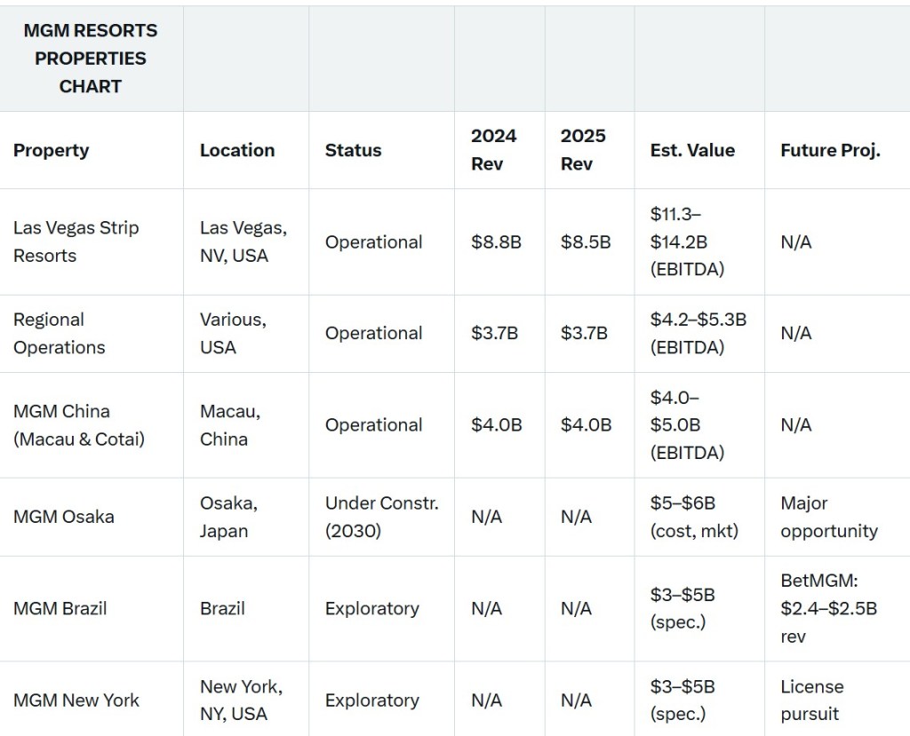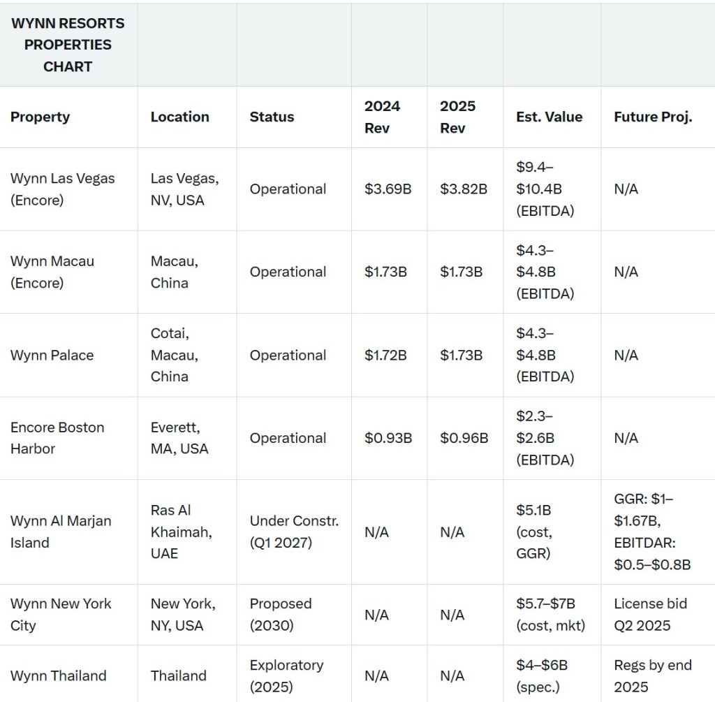 Wynn, with a market cap between $7.16B and $10.29B, carries more risk—negative equity and a high debt-to-equity ratio—but its premier luxury brand and global expansion (like Wynn Al Marjan Island in the UAE) offer serious growth potential. Wynn’s rooms cost 20-50% more than MGM’s, and the “wow factor” is unmatched. The sum of its current property values over $20B significantly exceeds its market cap, suggesting the market may not fully price Wynn’s assets.