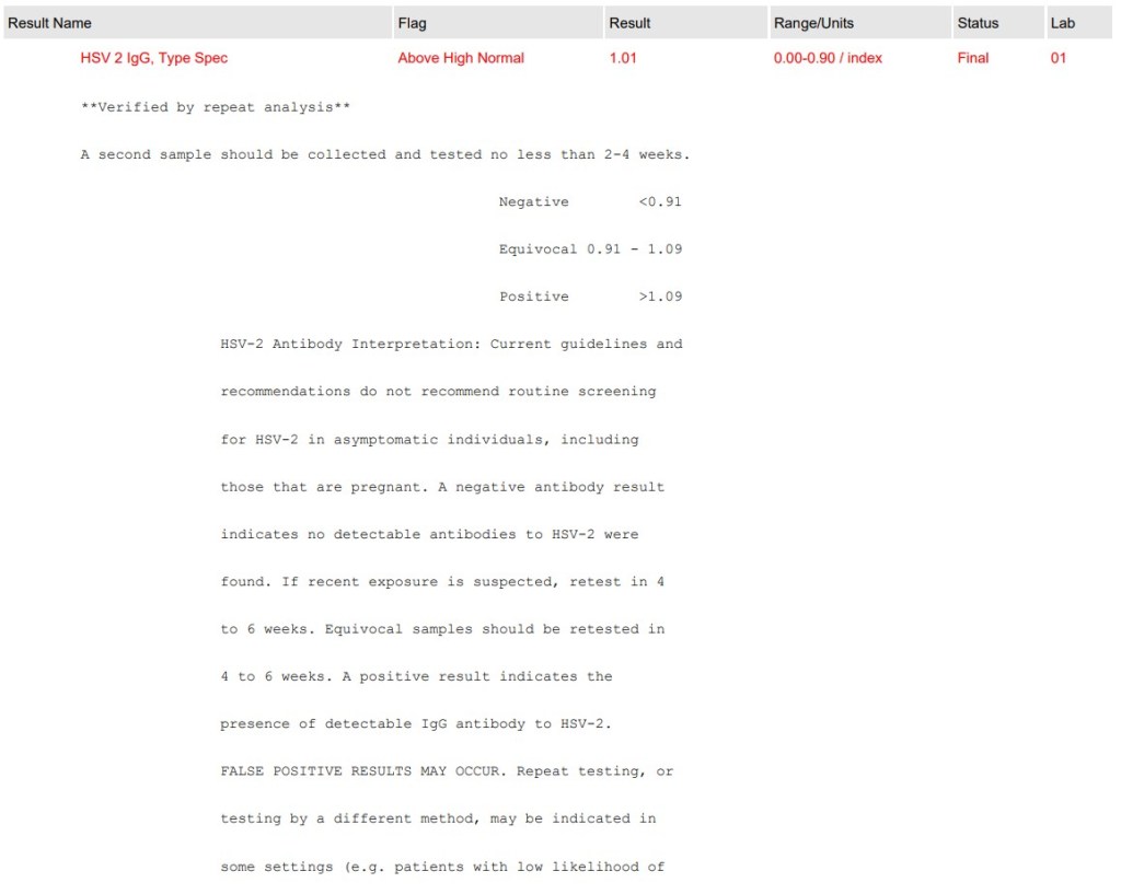 My Western Blot results for Herpes Type 2, The Gold Standard for Herpes blood tests.